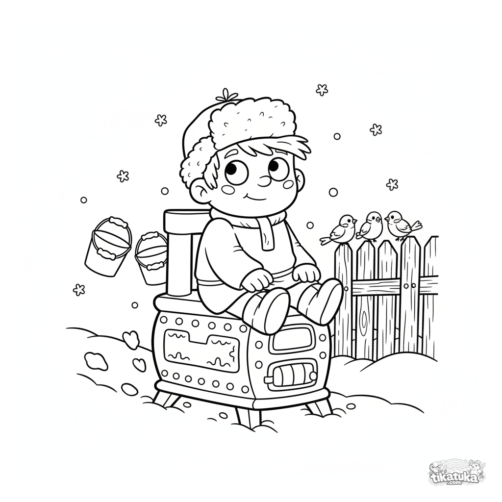 Fun coloring page from the tale of Emelya. The lazy but lucky Emelya rides his magic stove through a snowy village street. For kids 4-6 years old.