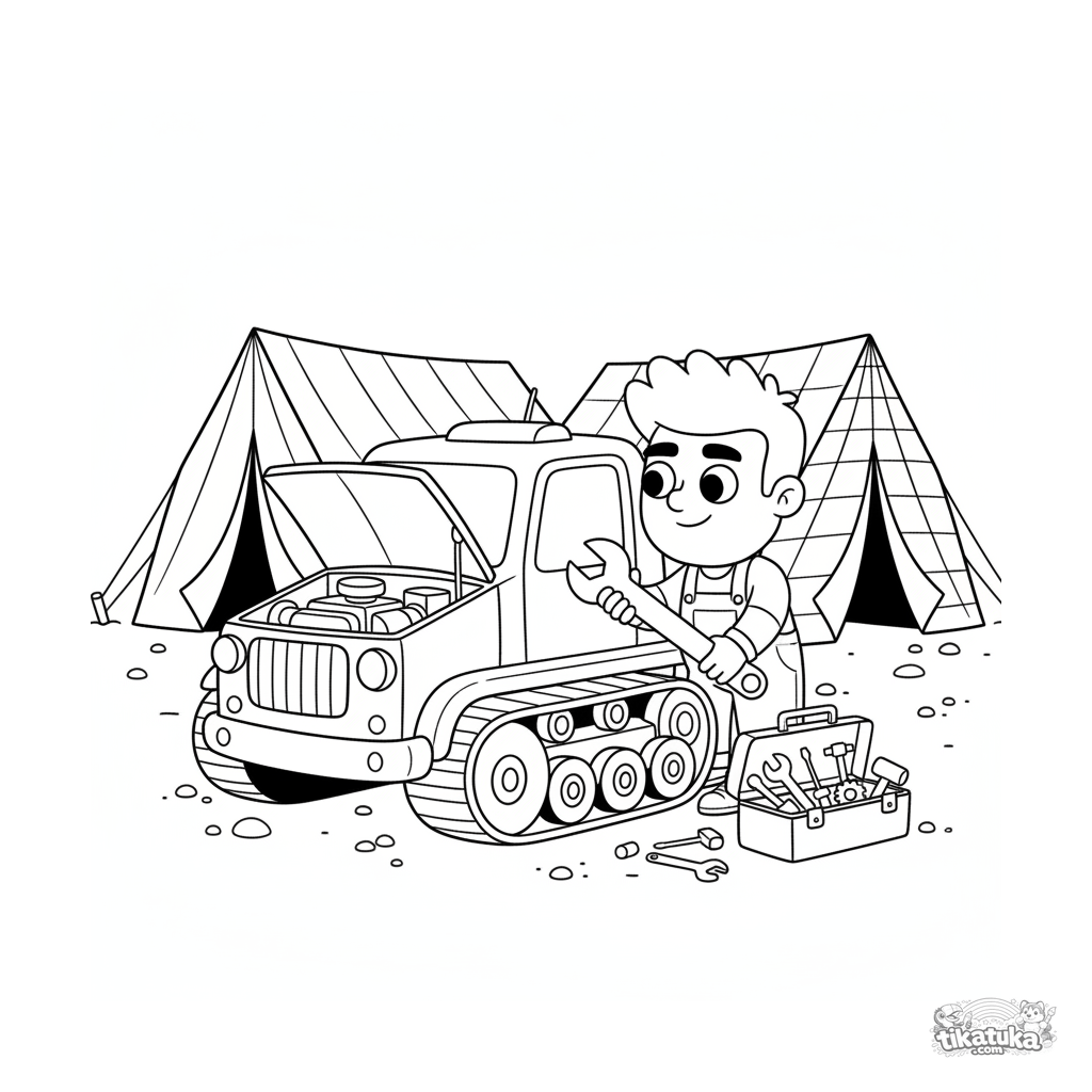 Detailed coloring page for boys 10-12: an engineer repairs a small tracked utility vehicle in the maintenance area of a field HQ. Dynamic comic style.