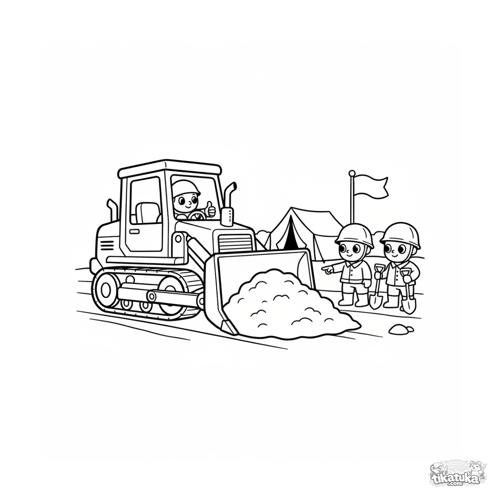 Coloring page of an engineer's bulldozer preparing ground for tents at a field camp. For kids 4-6 years. Features a bulldozer with a blade, an operator, and engineers.