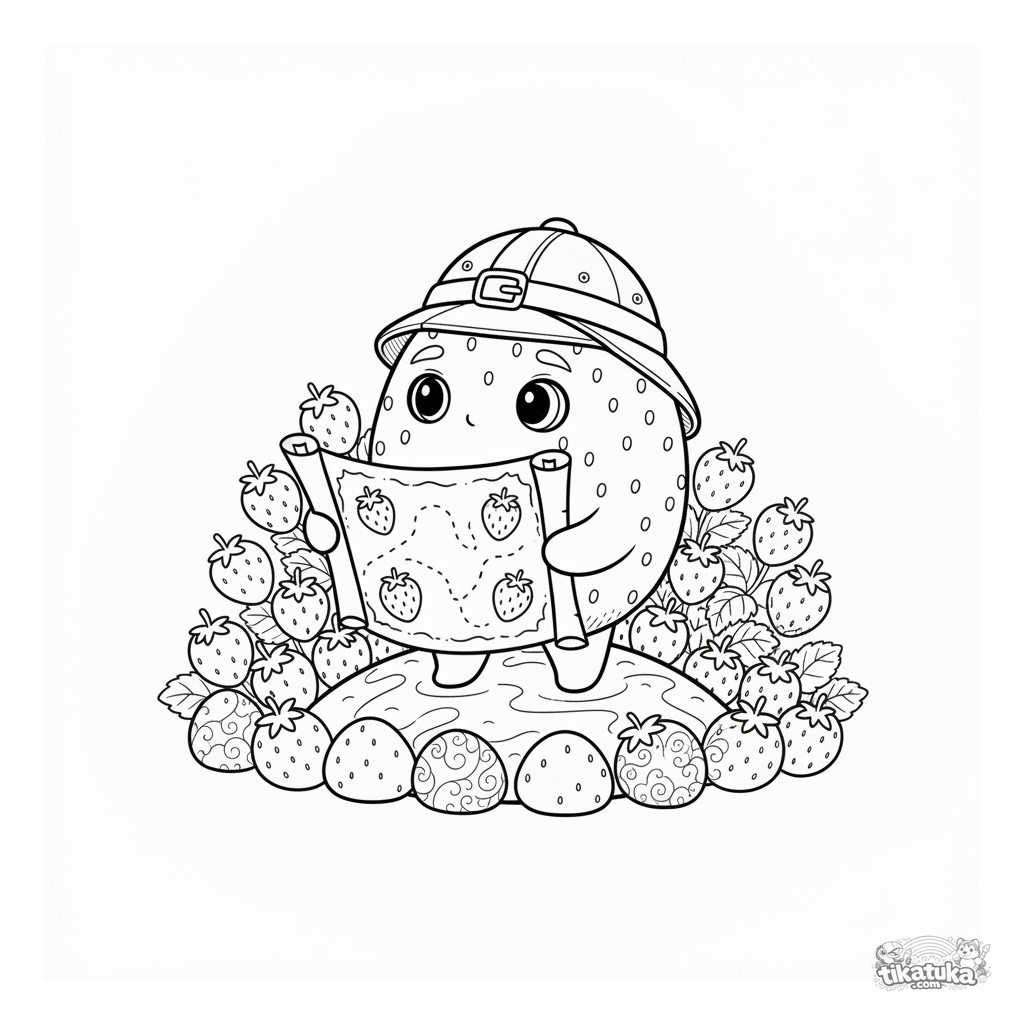 Realistic coloring page for kids 10-12 years old: an explorer mochi with a map in a field of strawberry mochi. Detailed outlines, adventure atmosphere.