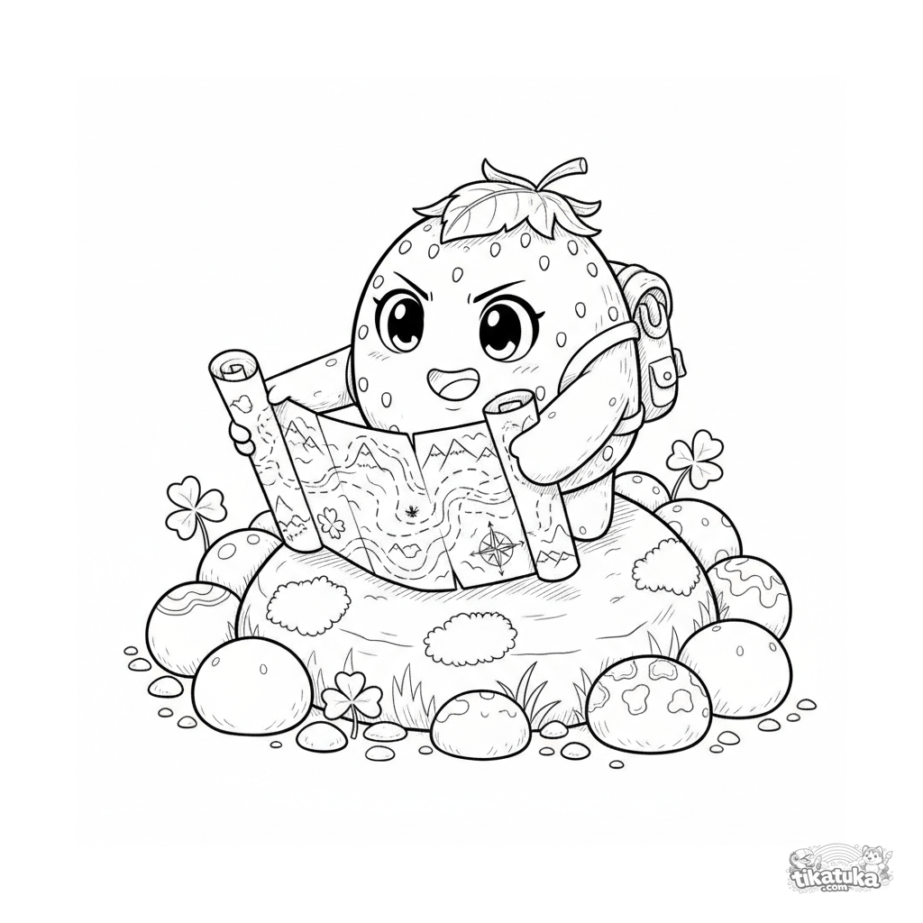 Detailed coloring page for ages 10-12: a strawberry mochi explorer in a leaf hat studies a map on a mossy stone among other mochi.