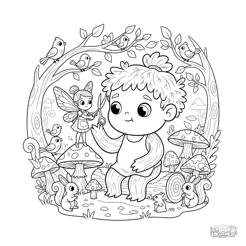 Coloring page for kids 4-6: a cute fairy barber gives a leafy haircut to a large, kind treant in an enchanted forest. A scene about friendship and care in classic cartoon style.