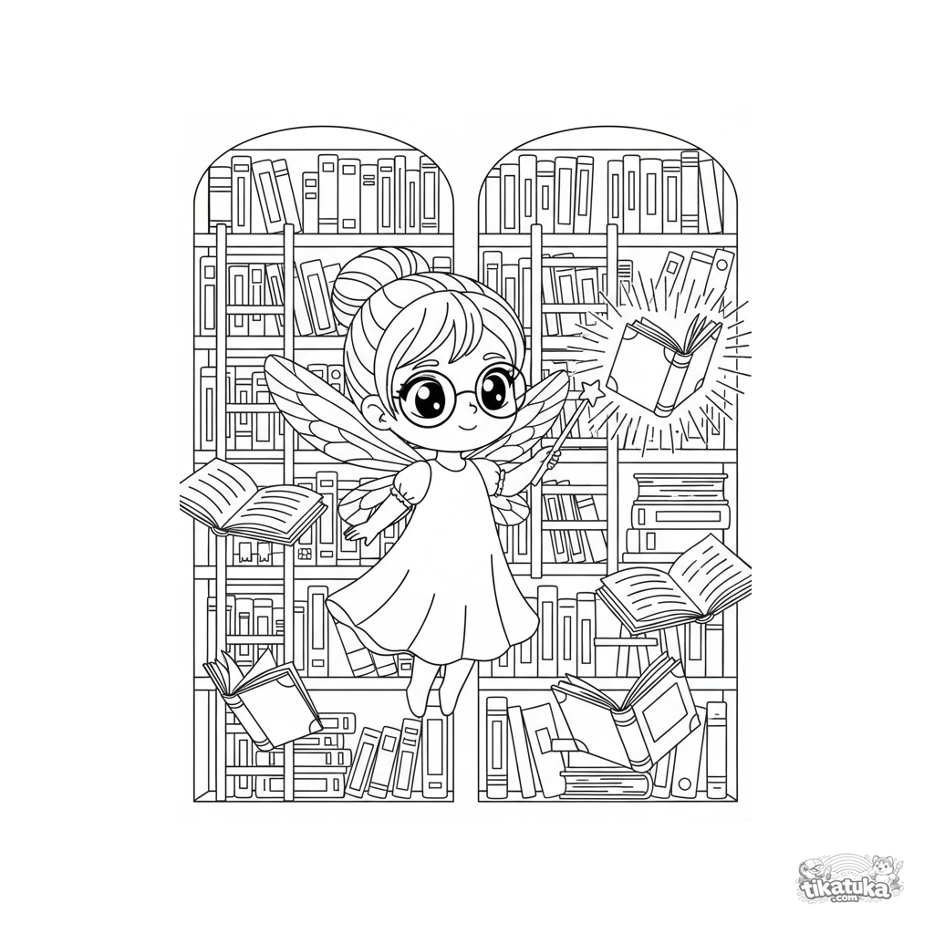 Coloring page for tweens 7-9: a fairy librarian with spectacles organizing glowing, fluttering books in a vast magic library. A fantasy scene with charming details.