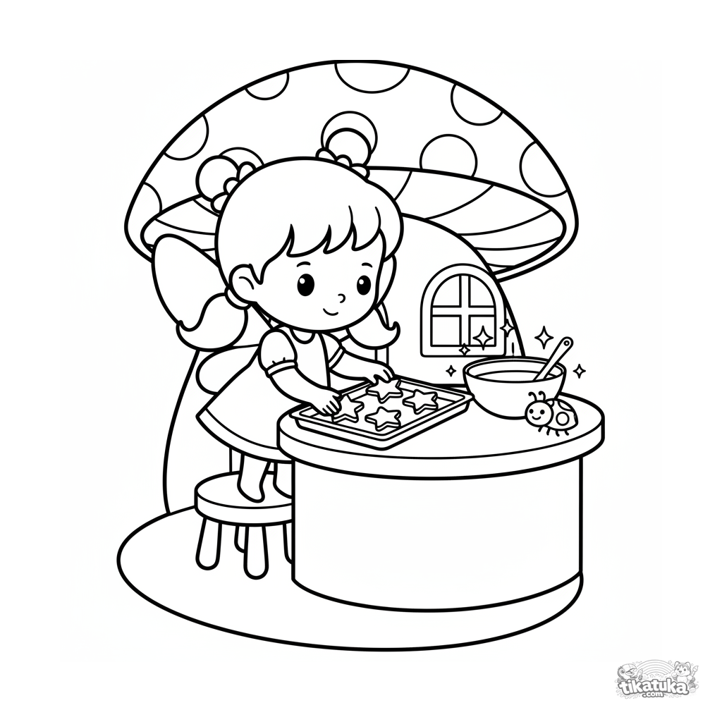 Simple coloring page for toddlers 2-3: a tiny fairy princess bakes magical cookies in her mushroom house kitchen. Very large, simple shapes.