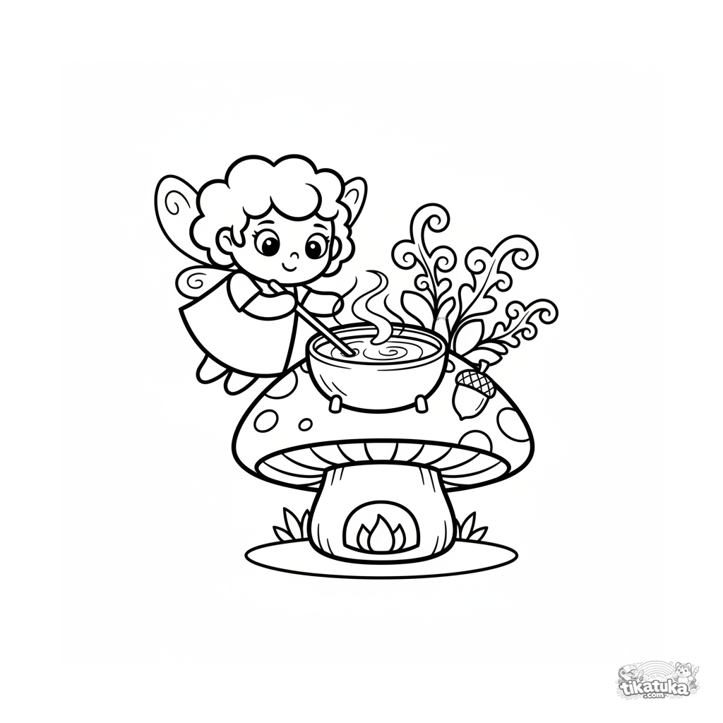 Simple coloring page for toddlers 2-3: a tiny fairy princess cooks magical soup on a mushroom. Large, friendly shapes.