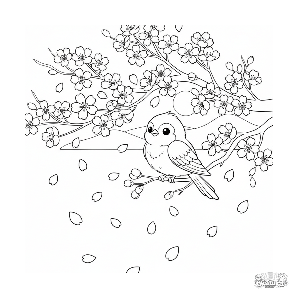 Cherry blossom branch with falling petals and a bird coloring page for kids 4-6. A delicate spring scene in a paper-cut style.