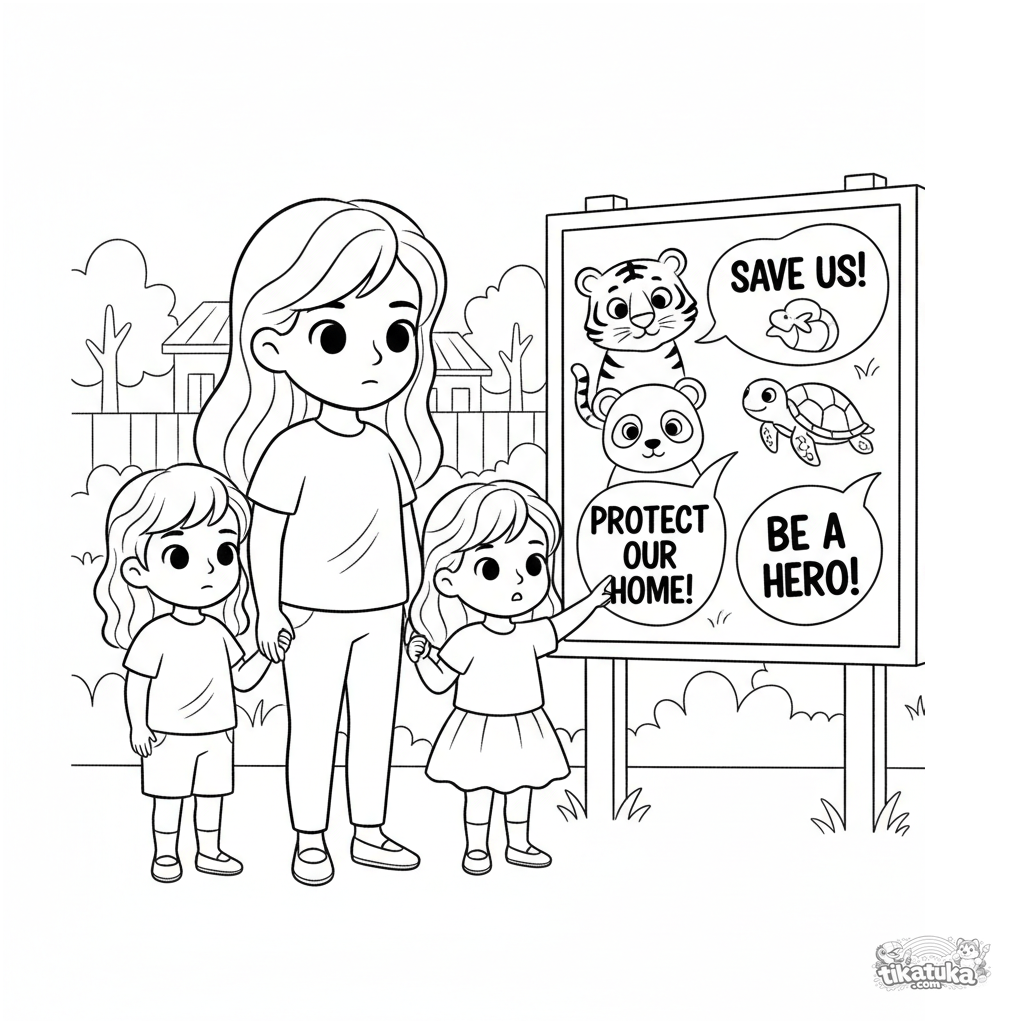 Coloring page for kids 4-6: a family learns from an information board about endangered animal species at the zoo. A theme of conservation and family learning.