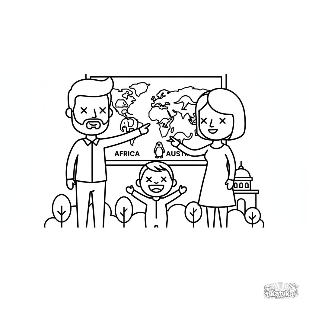 Coloring page for tweens 7-9: a family studies a world map showing animal habitats on a zoo information board. Educational scene about geography and animals.