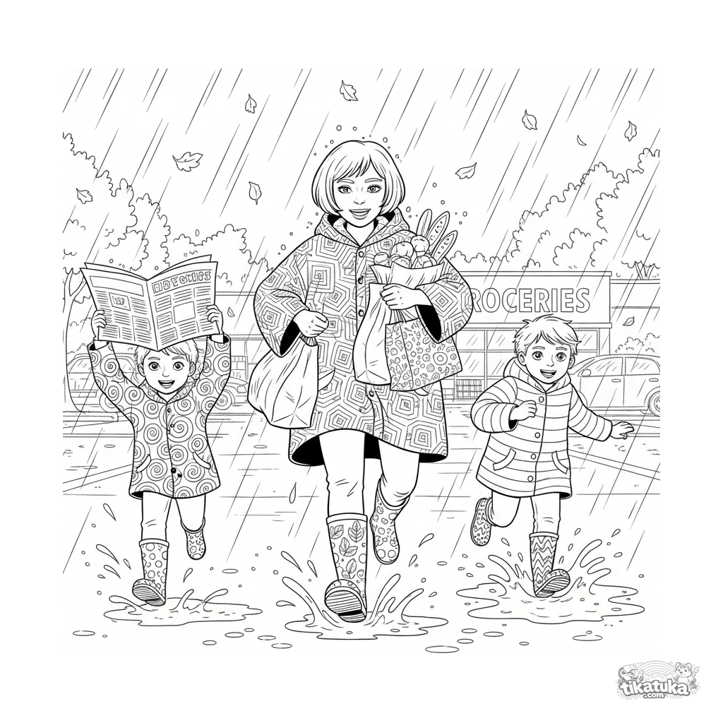 Coloring page for older kids 10-12 years: a family in rubber boots races to their car during an autumn downpour in a parking lot. Dynamic scene, graphic style, detailed.