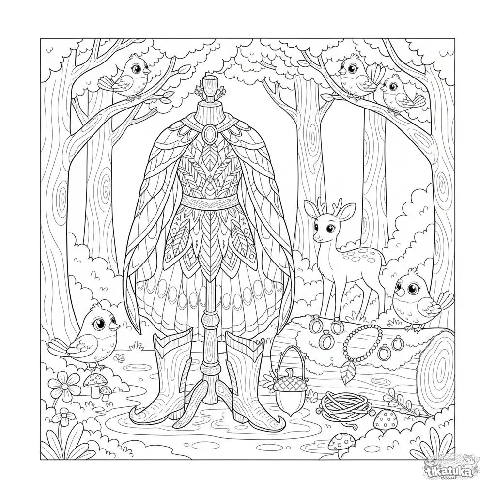 Coloring page for girls 10-12: a magical forest sprite outfit on a wooden dress form in a sunlit glade. Abundant natural details and accessories for creative coloring.
