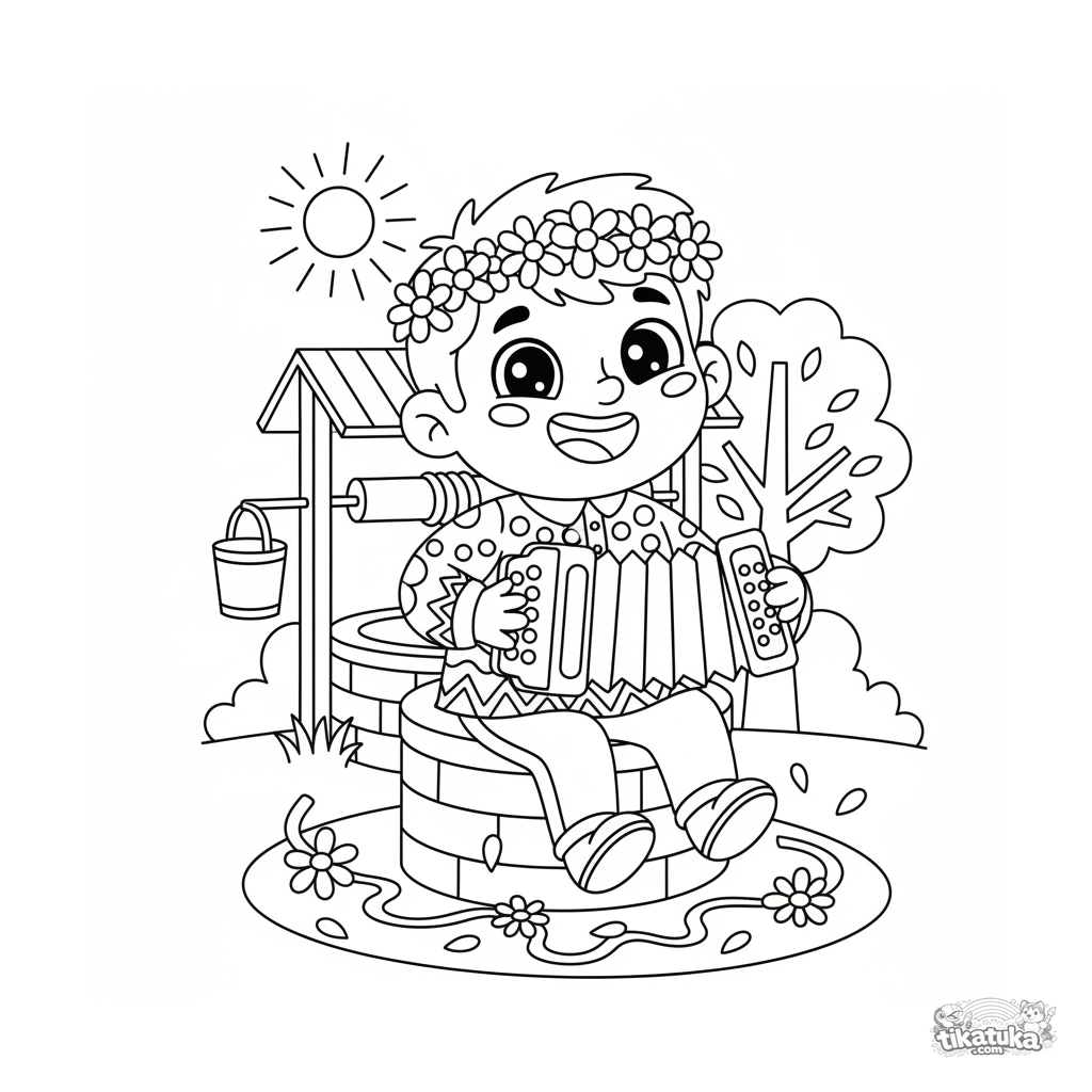 Coloring page for kids 4-6: a cheerful musician in a flower crown plays an accordion at the well of living water during a festival. Bright scene in a paper-cut style with ribbons and flowers.