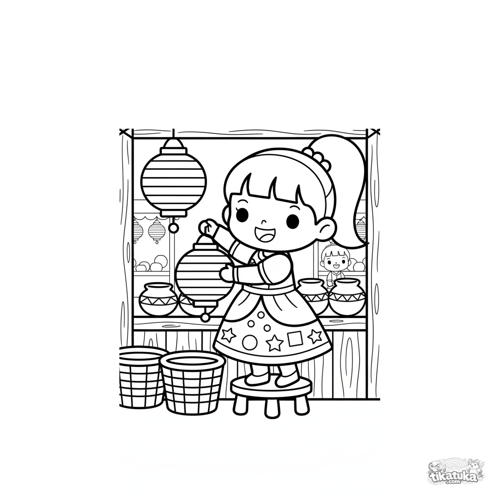 Toddler coloring page 2-3: a happy princess decorates her market stall with paper lanterns during a town festival. Very simple, large shapes.