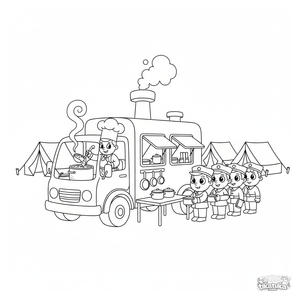 Coloring page for tweens 7-9: a friendly field kitchen truck is serving food to soldiers at the field headquarters. The cook ladles stew, a line forms.