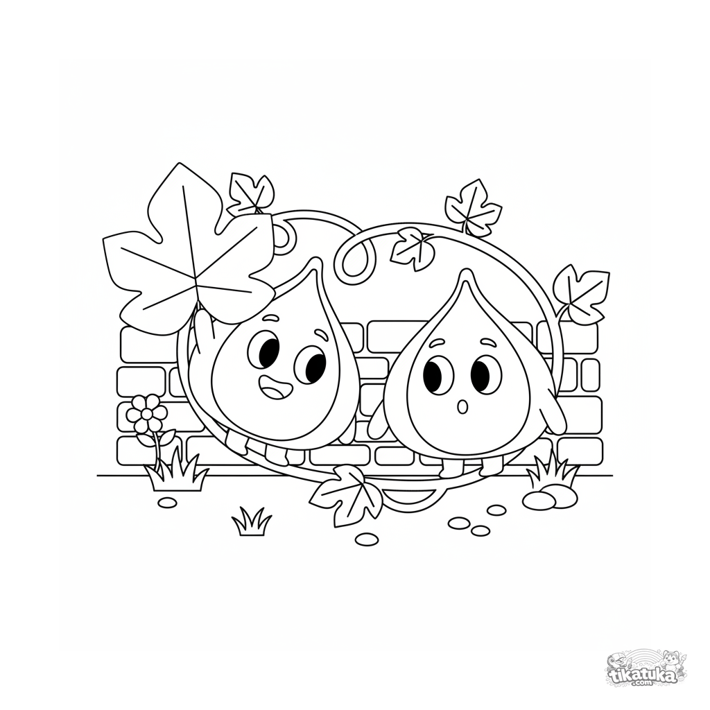 Coloring page with two figs on a vine, one hiding behind a leaf. For tweens 7-9 years old. A scene of friendship and play in the garden.