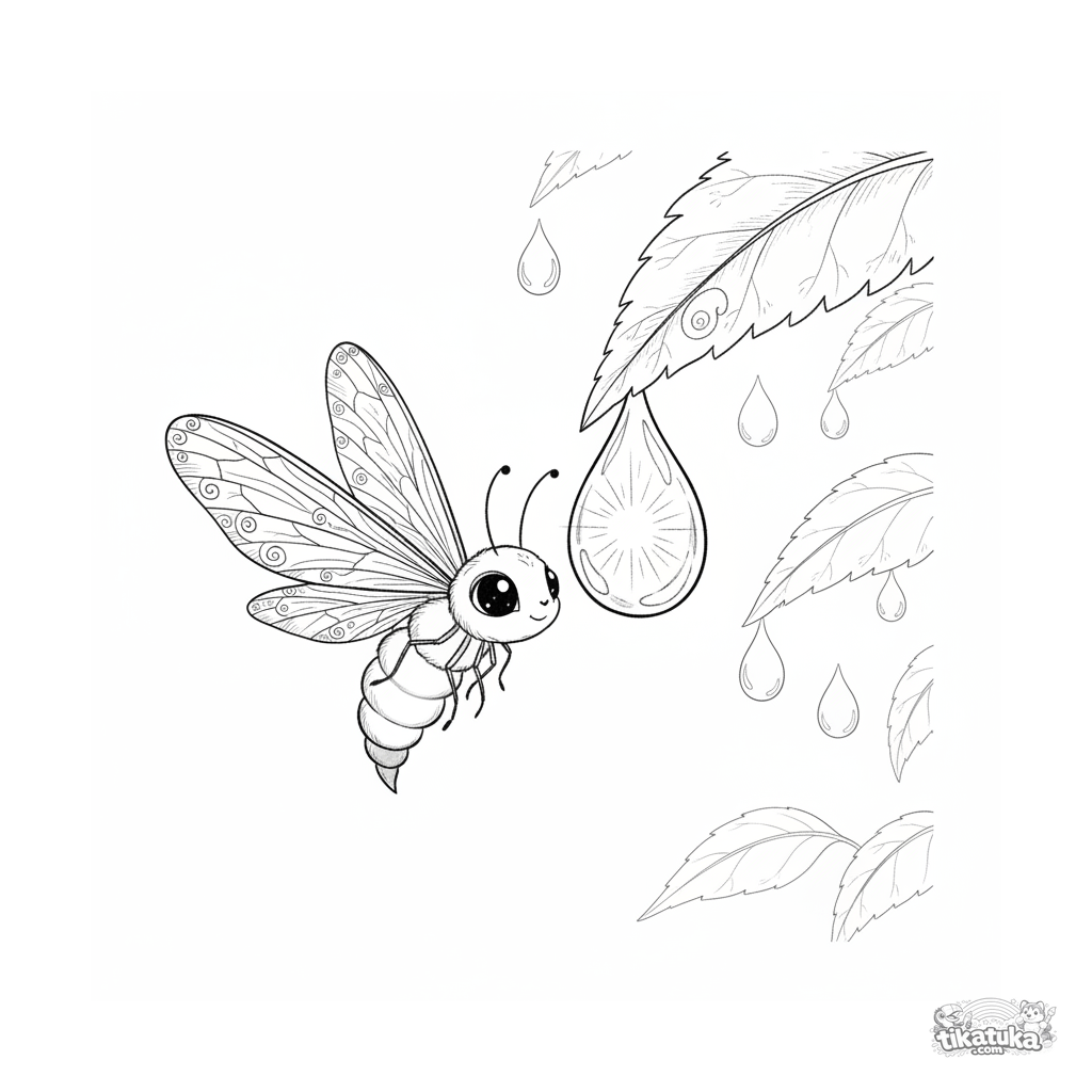 Complex coloring page for older kids 10-12 in a watercolor-sketch style: a firefly's glow illuminates a hanging dewdrop from within, creating a magical night scene on a leaf.