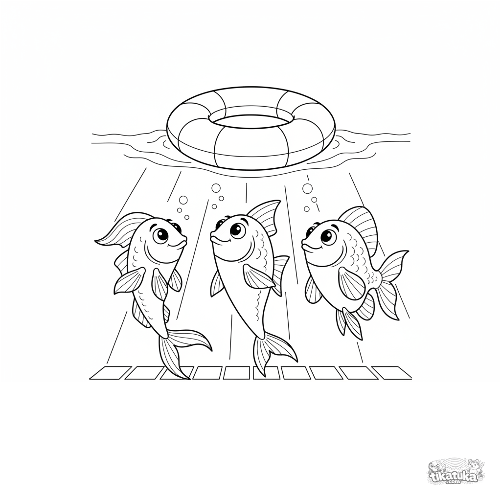 Coloring page for kids 4-6: a school of three different fish swims in sync under an inflatable ring at the pool bottom. Natural poses, light rays, and curious looks.