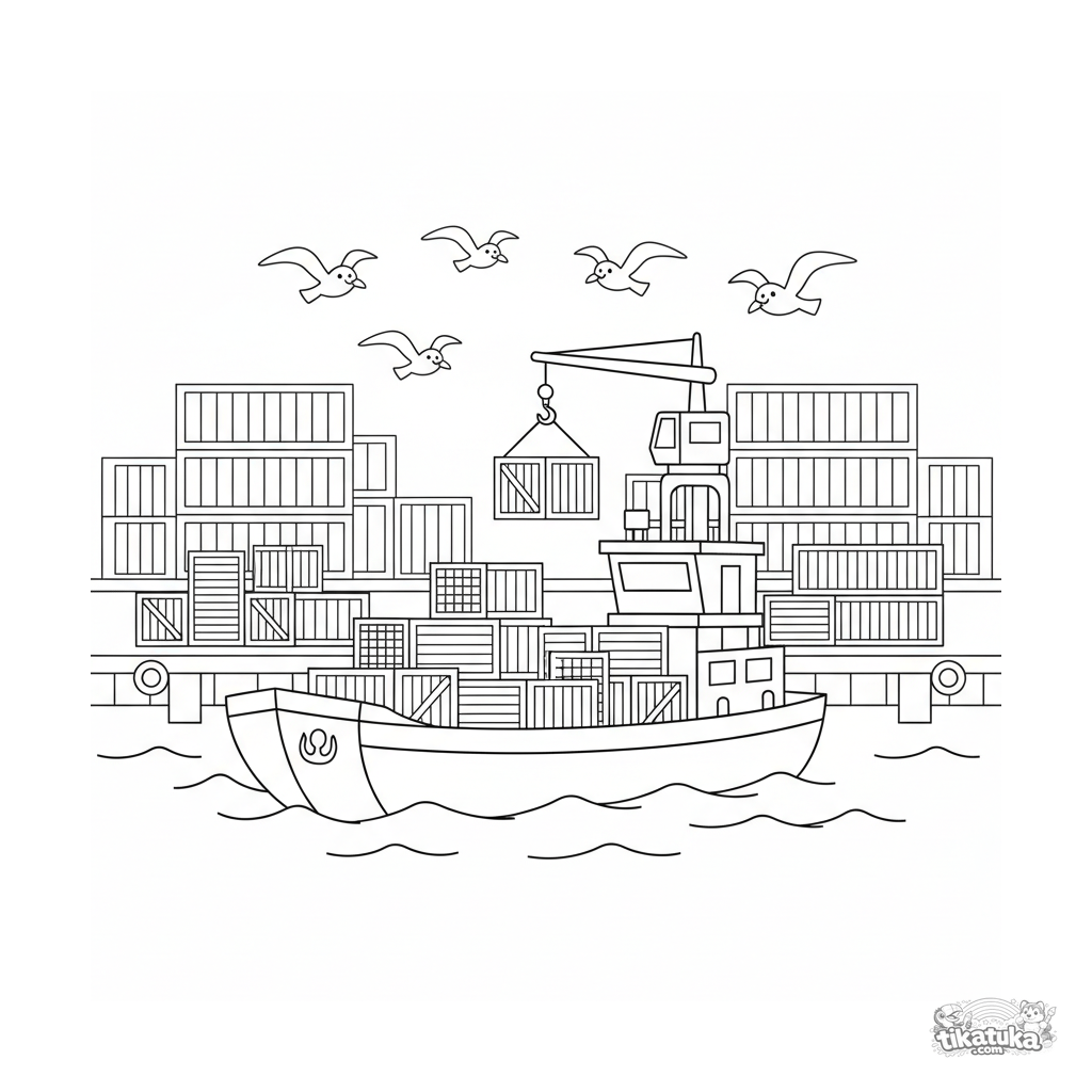 Coloring page for tweens 7-9: a cargo barge in a flat vector style is being loaded in an industrial harbor. Geometric shapes, containers, crane.