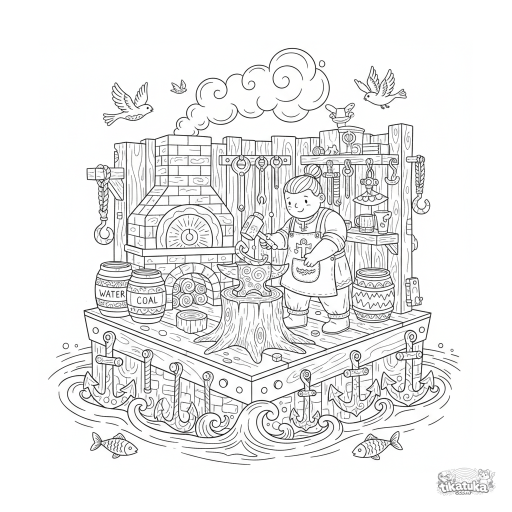 Coloring page of a floating blacksmith workshop in folk lubok style for ages 10-12. Details: forge, anvil, blacksmith with hammer, tools, barrels.