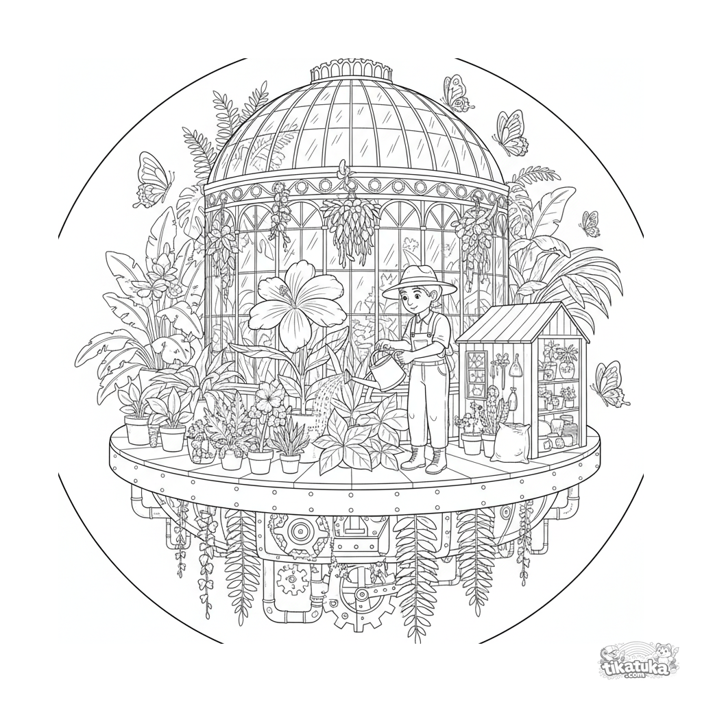 Naturalistic coloring page of a floating botanical conservatory for ages 10-12. Lots of plant details, glass architecture, gardener at work.