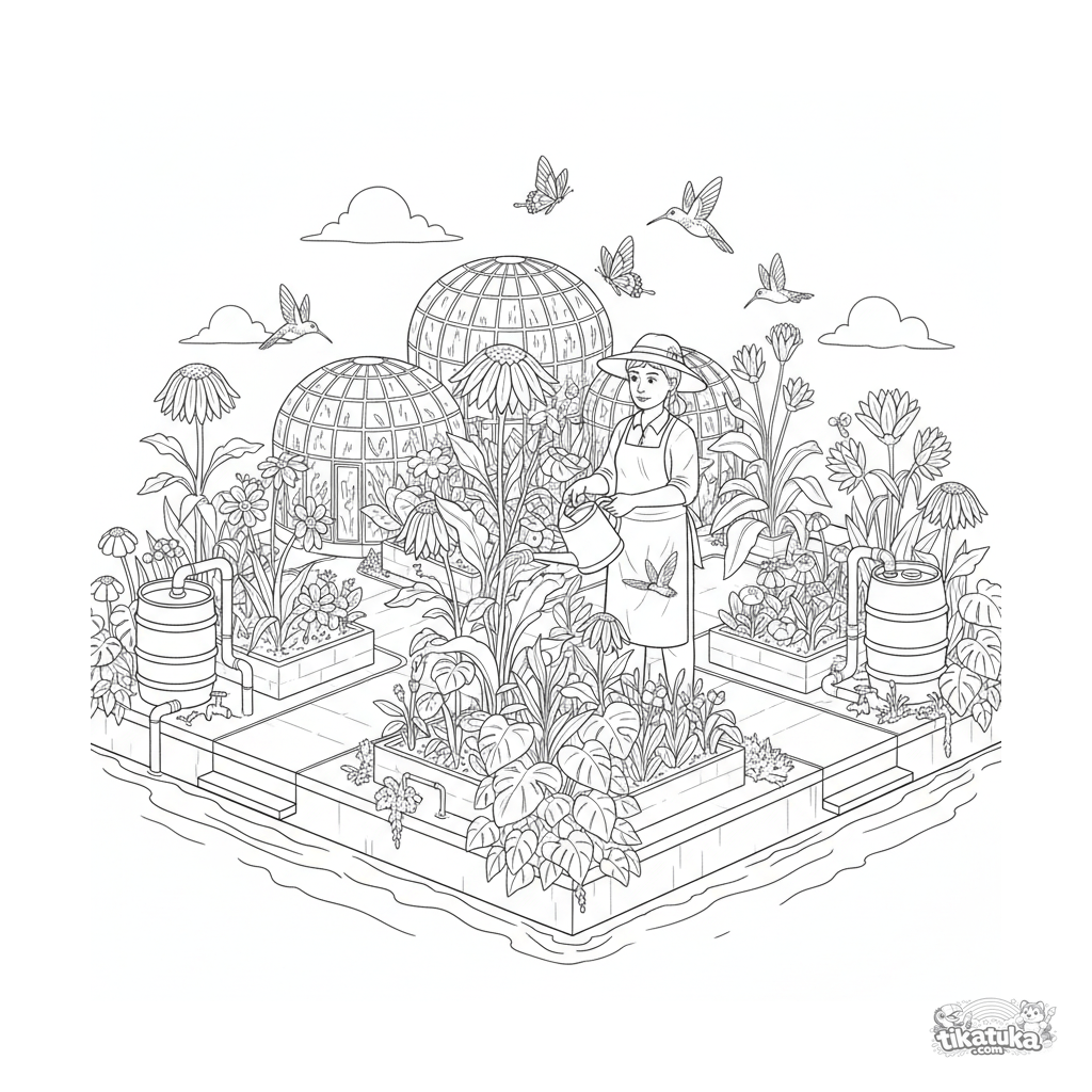 Coloring page of a detailed floating botanical garden for ages 10-12. Image with greenhouses, paths, gardener, and butterflies.