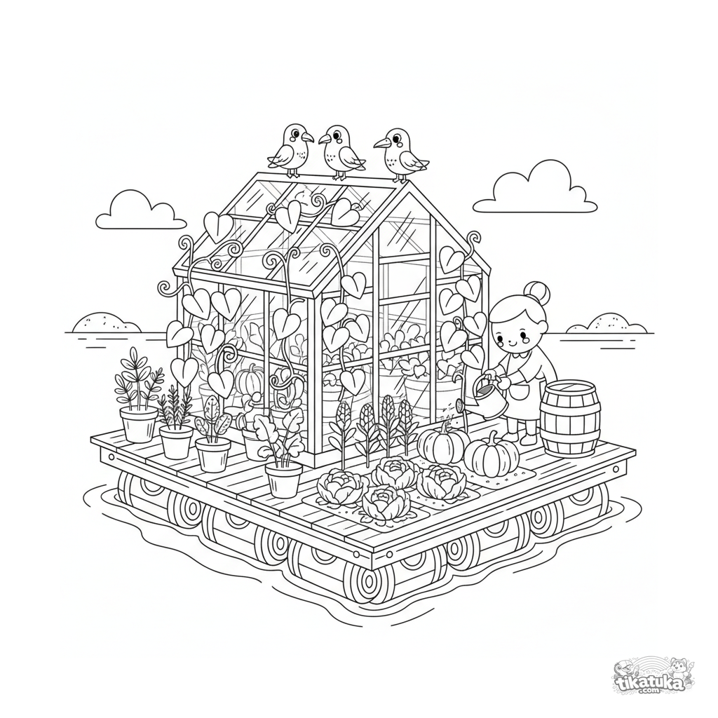 Coloring page for ages 10-12: a detailed floating garden with a greenhouse on a sea platform. Scene includes a gardener, potted plants, and seabirds.