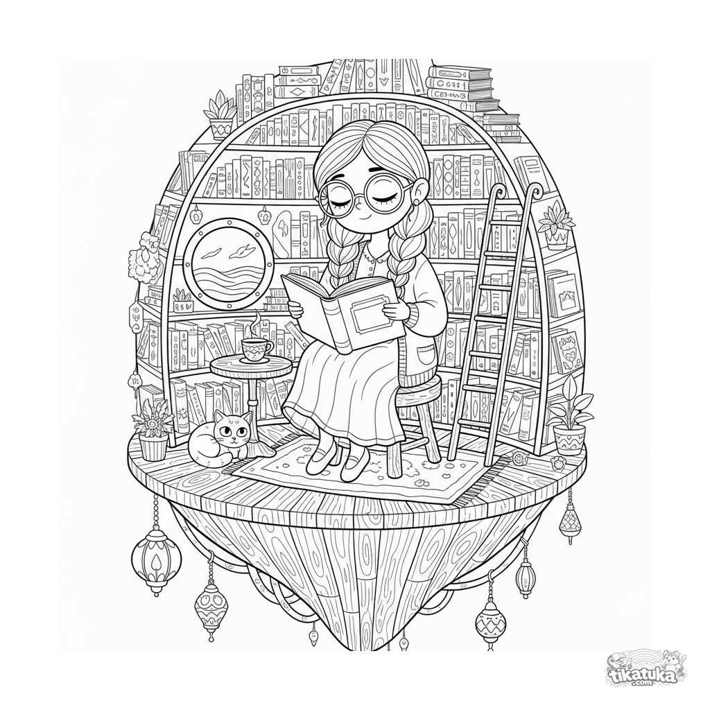 Coloring page for ages 10-12: a cozy floating library on a sea platform. Detailed scene with bookshelves, a ladder, a porthole, and a cat.