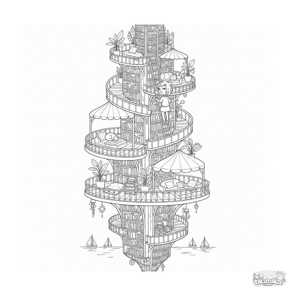 Coloring page for kids 10-12: a multi-level floating library platform with a spiral ramp, bookshelves, and cozy reading nooks. A librarian on a ladder, a cat sleeps.