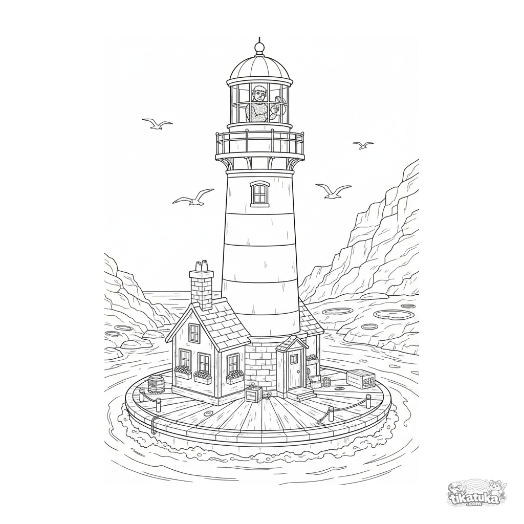 Coloring page for kids 10-12: a detailed floating lighthouse with keeper's cottage on a circular platform in a rocky cove. Keeper, gulls, waves, and architectural details.