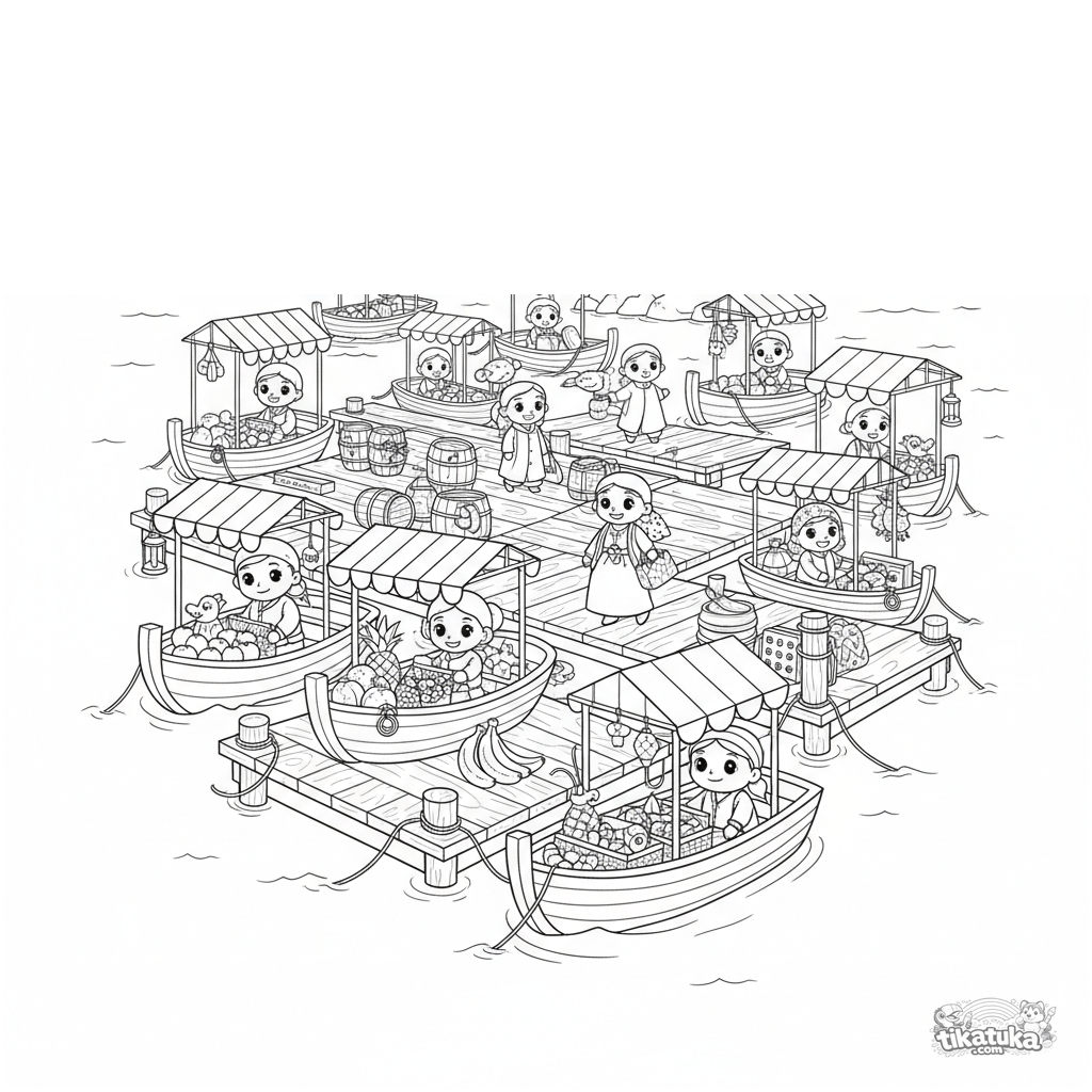 Coloring page: a bustling floating market on wooden platforms at sea for kids 10-12. Detailed scene with boats, stalls, shoppers, and a distant lighthouse.