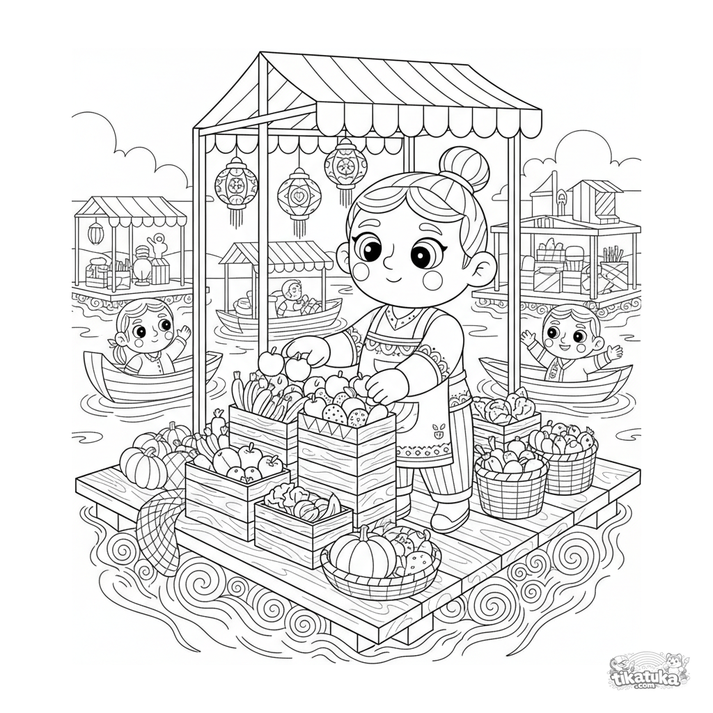 Coloring page for ages 10-12: a bustling floating market on a sea platform. Detailed scene with stalls, awnings, boats, and customers.