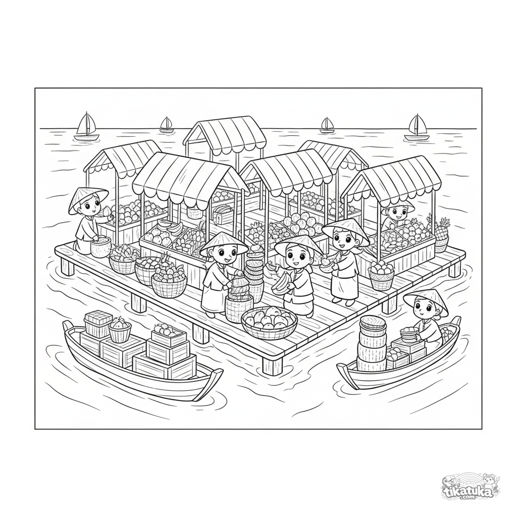 Coloring page: a bustling floating market on a wooden platform at sea for kids 10-12. Detailed stalls, boats, and vendor figures.