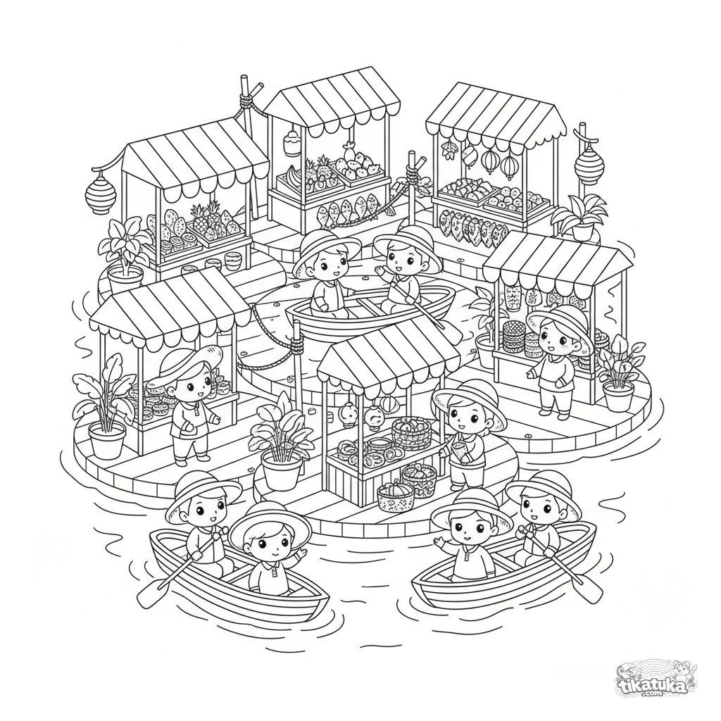 Coloring page for kids 10-12: a bustling floating market on wooden platforms in a sea bay, with stalls, boats, and vendors. A detailed scene for coloring.