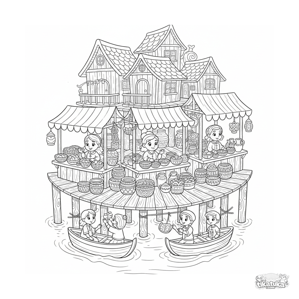Complex coloring page of a floating market with stilt houses for ages 10-12. Lots of details: boats, merchants, goods.