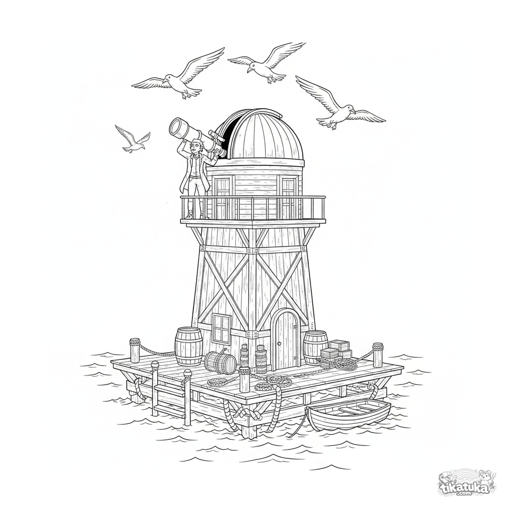 Coloring page for ages 10-12: a detailed floating sea observatory with a telescope on a wooden platform. Complex scene with a scientist, seabirds, and maritime details.