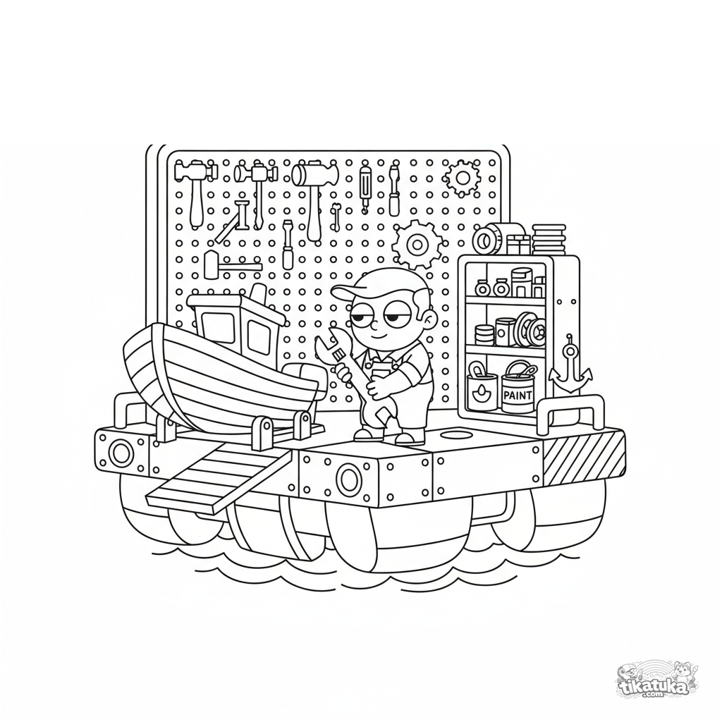 Geometric coloring page of a floating boat repair workshop on a sea platform for ages 10-12. A mechanic works with tools, a boat is on a ramp.