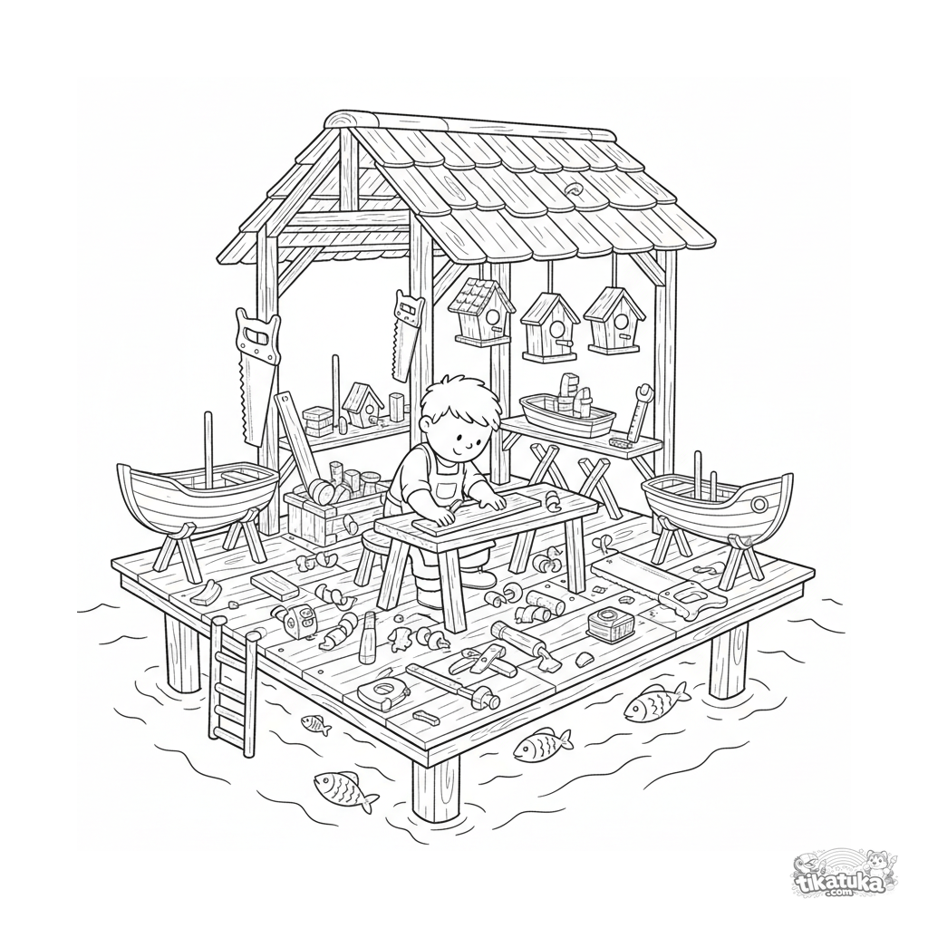 Detailed coloring page for kids 10-12: architecture of a floating carpentry workshop at sea with tools, wood shavings, and boats being built.