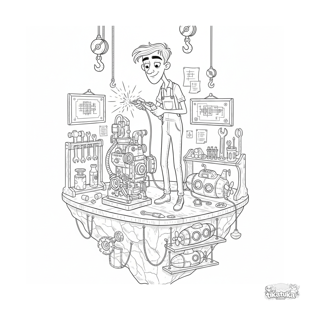 Coloring page for ages 10-12: an engineer works in a floating workshop at sea. Complex scene with machinery, blueprints, tools, and welding sparks.