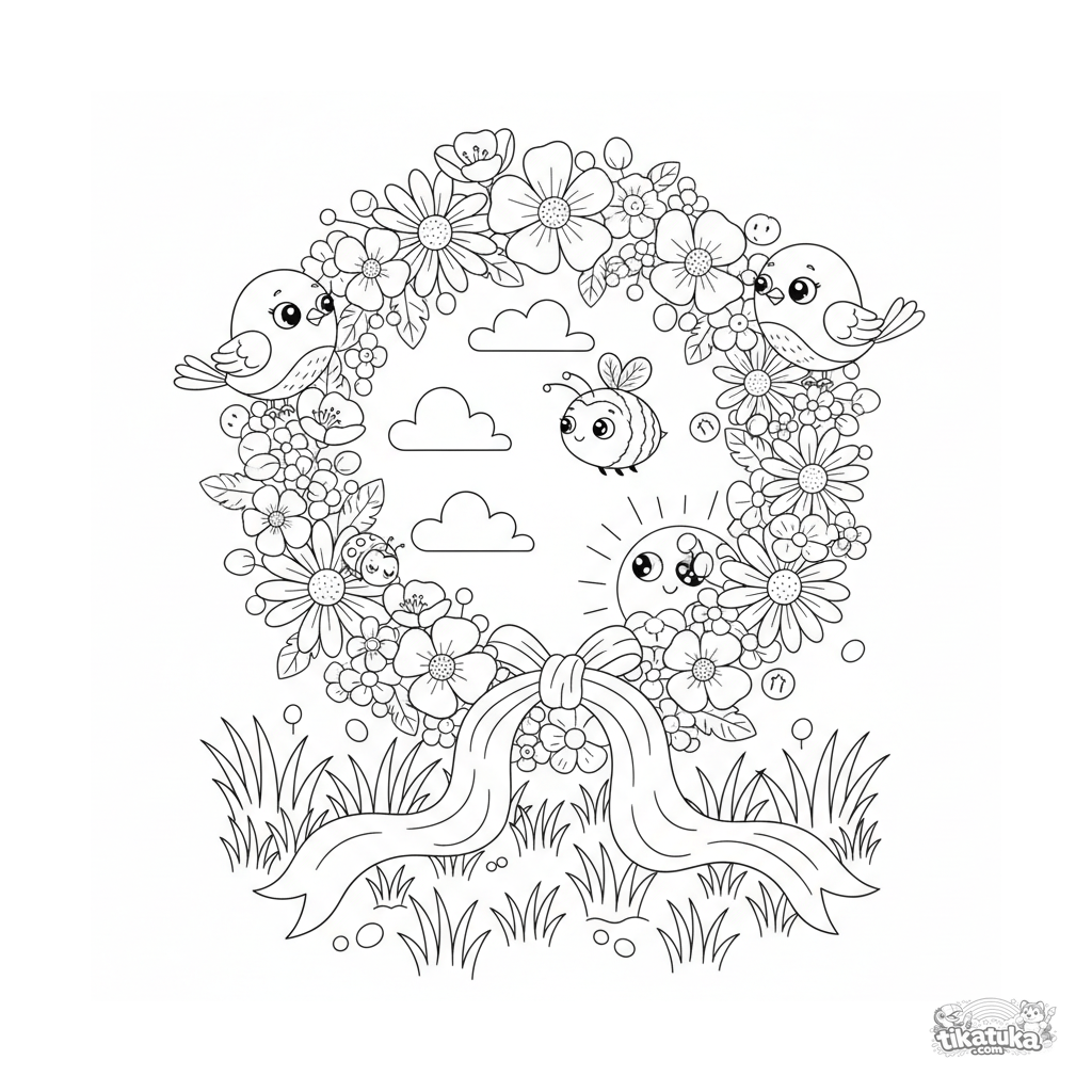 Coloring page of a flower wreath made of wildflowers with a ribbon for kids 4-6. Wreath lies on a meadow, storybook style, various flowers.