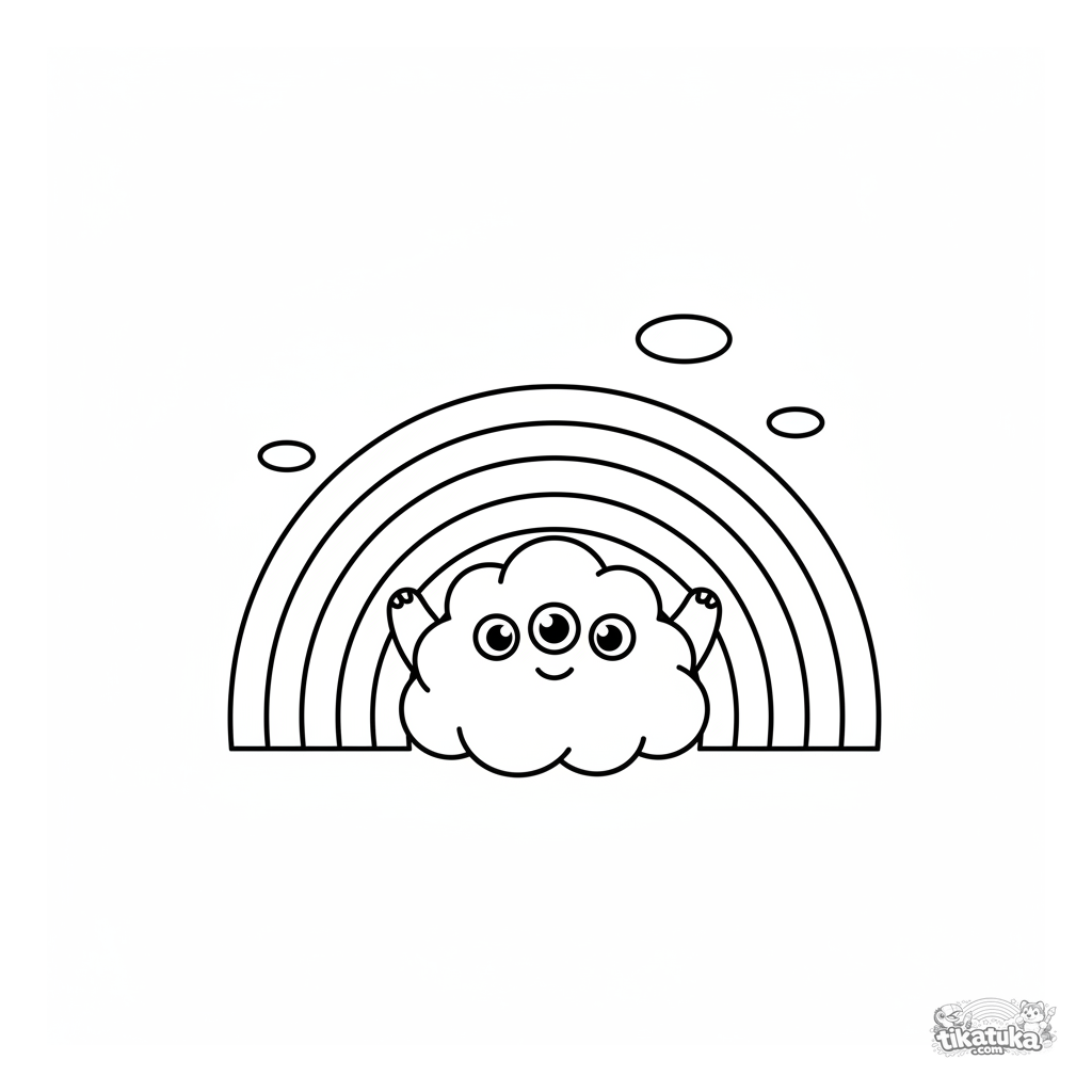 Coloring page with a cute, fluffy cloud monster hiding behind a rainbow. For kids aged 4-6. Friendly character, very simple and large shapes.