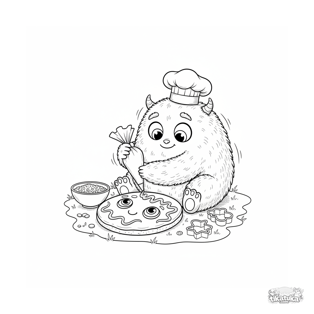 Detailed coloring page for kids 10-12: a fluffy monster chef decorating a giant cookie at a picnic. Lots of textures and interesting elements.