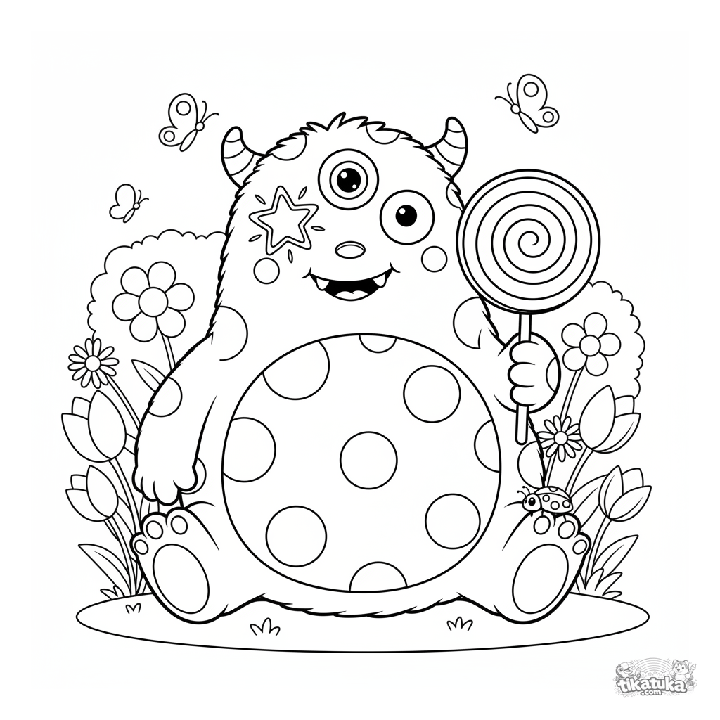 Kids coloring page: a fluffy monster with three mismatched eyes holds a lollipop in a flower garden. A fun, bright scene with a ladybug friend.