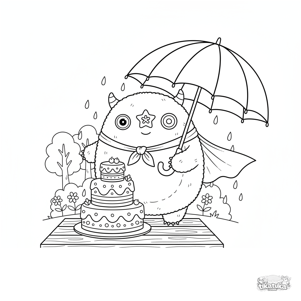 Coloring page for kids 7-9: a fluffy monster with three eyes and an umbrella guarding a celebration cake on a picnic table. Proud expression, details: napkin cape, raindrops.