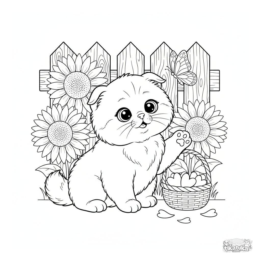 Coloring page of a cute fluffy kitten playing with a butterfly among sunflowers. For kids aged 3-6. Simple lines, perfect for young artists.
