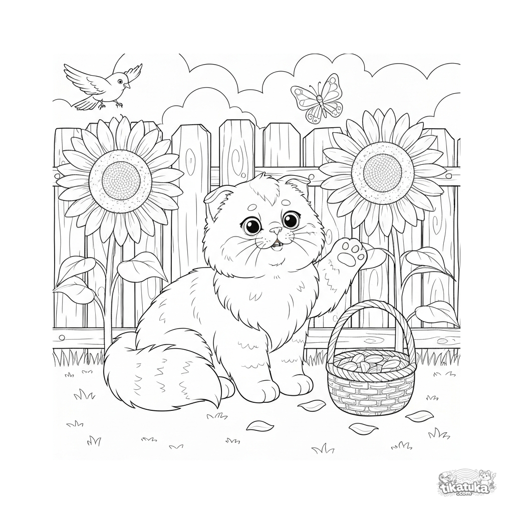 Coloring page of a cute Persian kitten playing with a butterfly among sunflowers. For kids aged 3-6. Simple details for easy coloring.