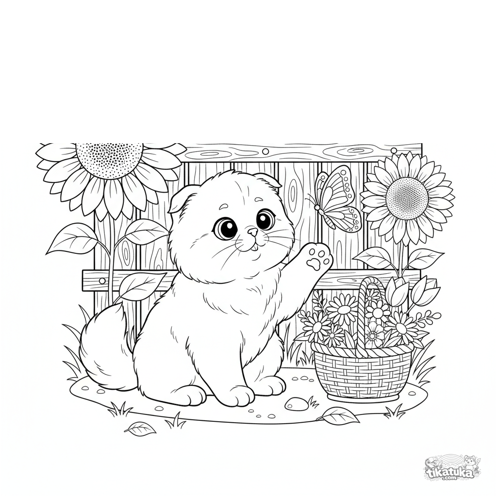 Coloring page for kids 3-6: a fluffy kitten with folded ears plays with a butterfly among giant sunflowers near an old wooden fence.