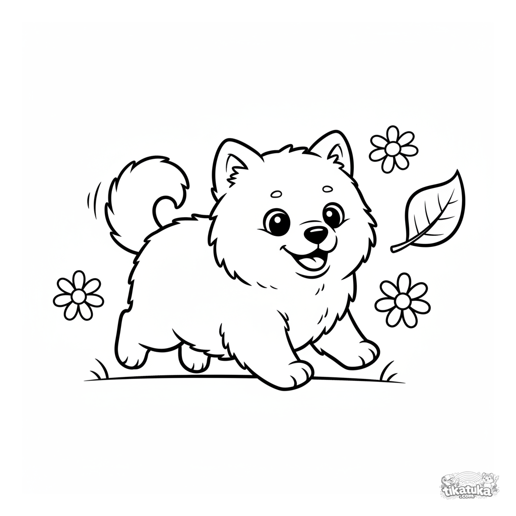 Toddler coloring page: a fluffy Samoyed puppy happily chases a leaf in a meadow. Simple large shapes with wide white margins for easy coloring by kids ages 2-3.