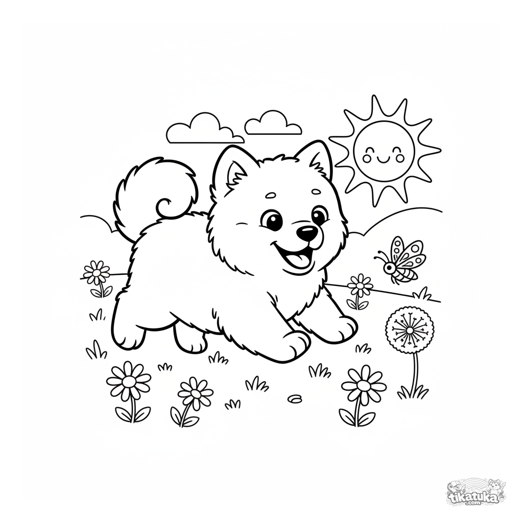 Coloring page for kids 4-6: a fluffy Samoyed puppy happily chases a moth in a daisy meadow. Simple shapes and a cute scene for creative fun.