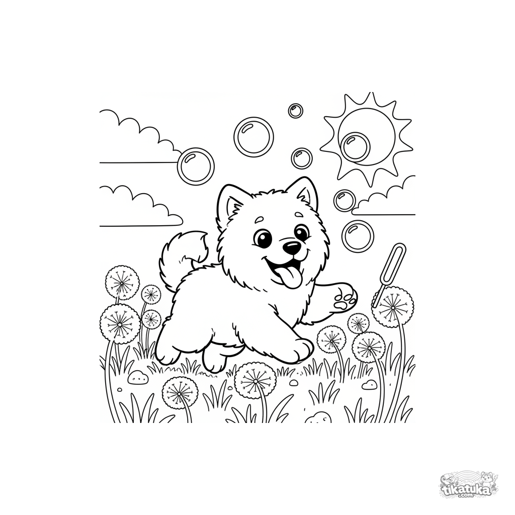 Coloring page of a fluffy Samoyed puppy joyfully chasing soap bubbles in a dandelion meadow. For kids aged 3-6. Simple lines and a cute scene.