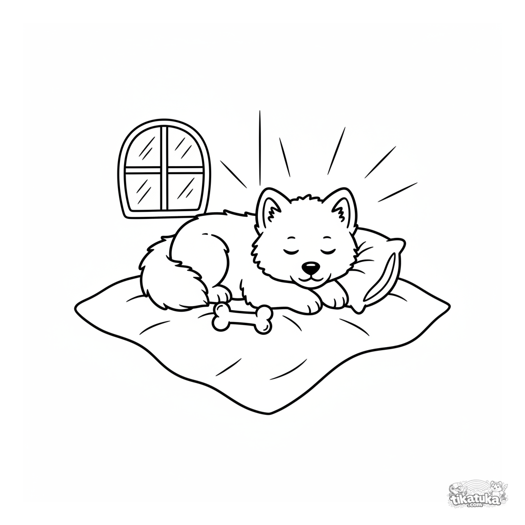 Coloring page for toddlers: a fluffy Samoyed puppy sleeping soundly on a cozy blanket. Simple, large shapes perfect for kids aged 2-3.