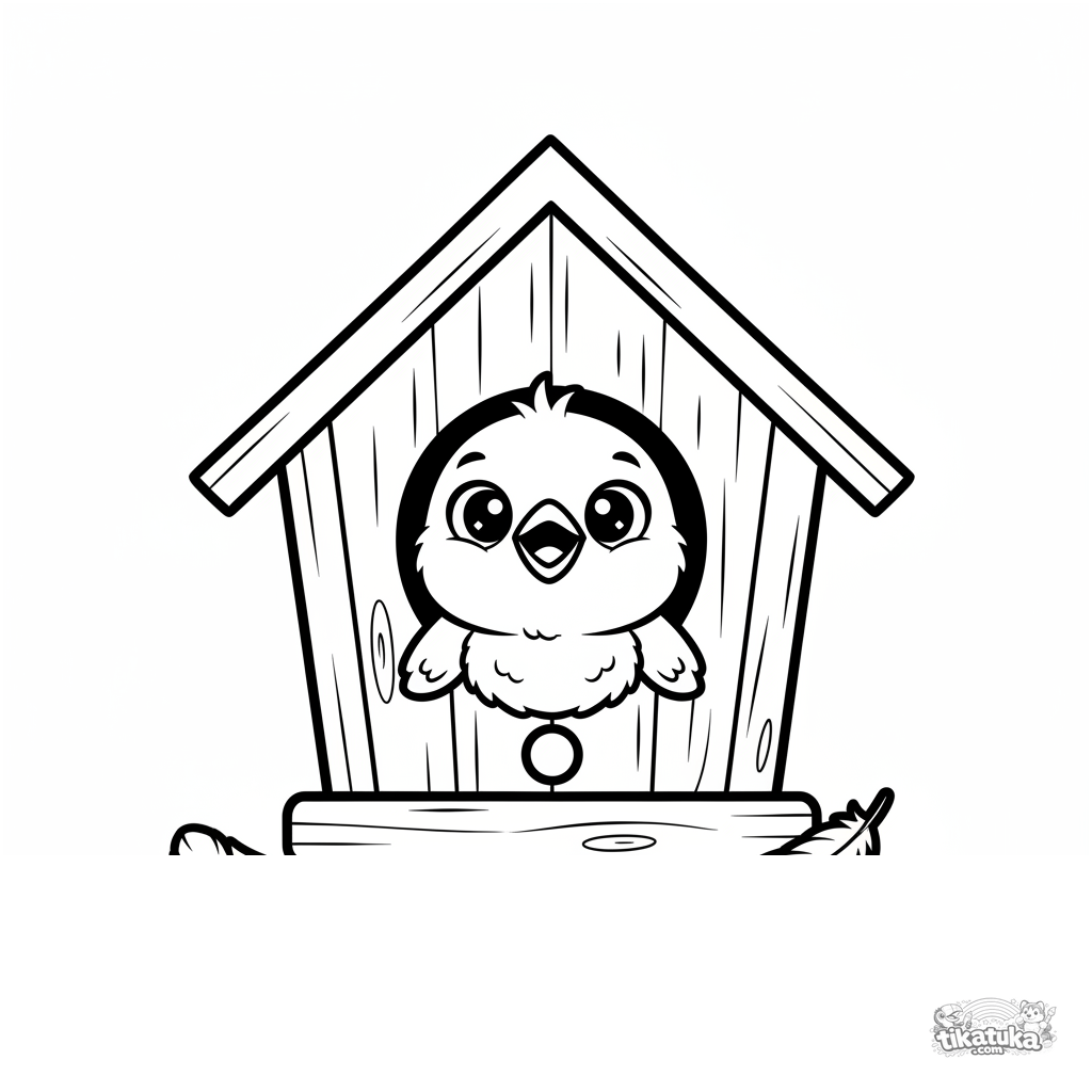 Toddler coloring page: a fluffy sparrow chick peeking from a round window in a wooden birdhouse. Simple large shapes with wide margins for easy coloring.